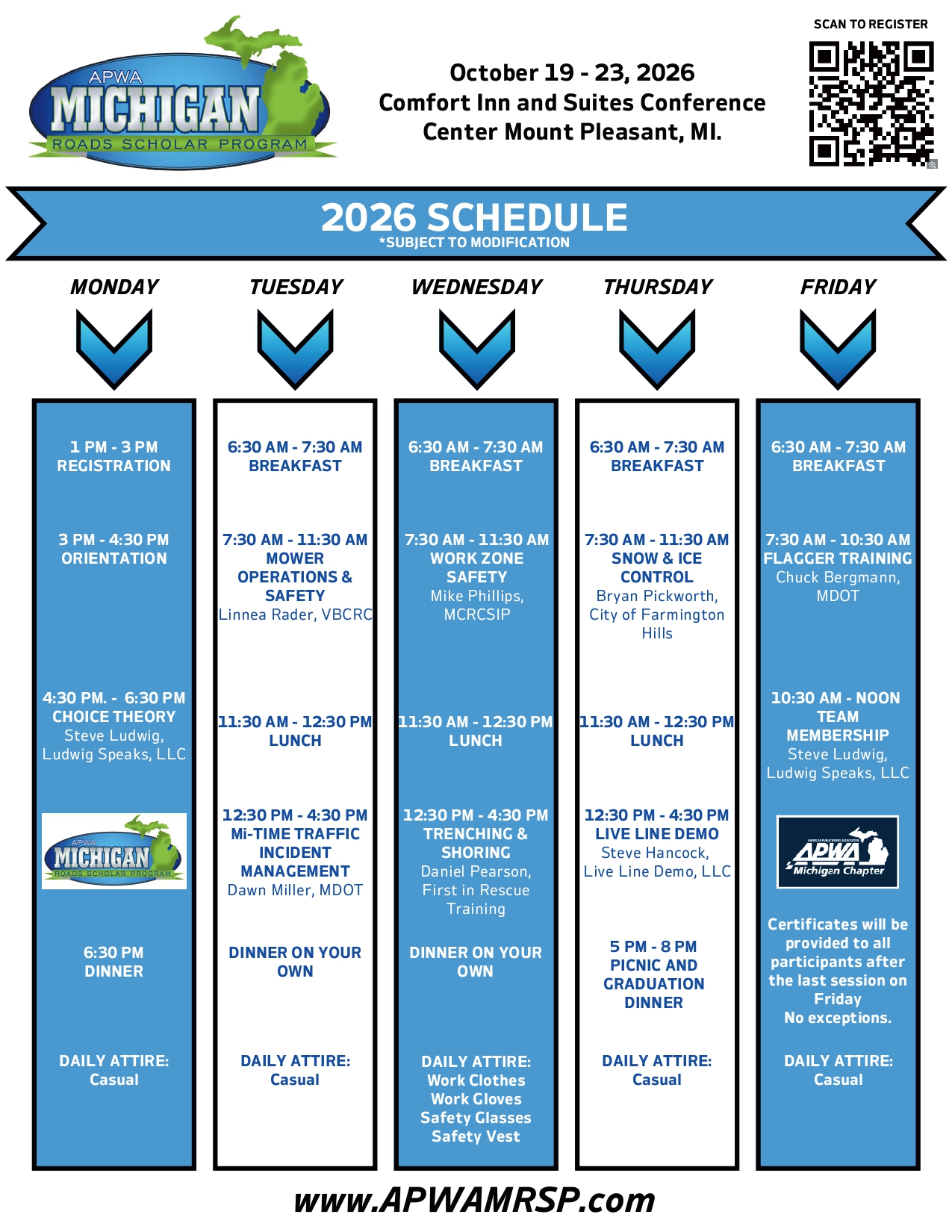 Participants who successfully attend all three training years will be designated as an APWA Michigan Roads Scholar.